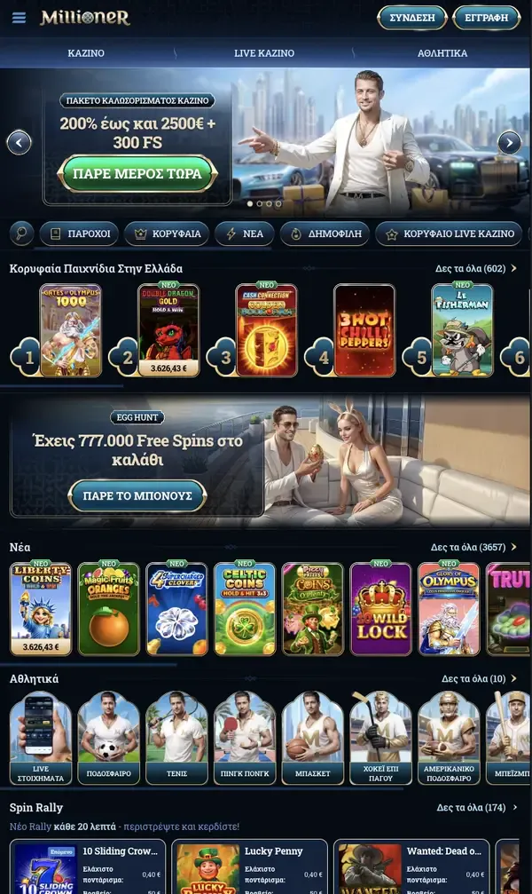 Καλώς ήρθατε στο Millioner Casino από κινητό, όπου μπορείτε να ανοίξετε λογαριασμό, να μπείτε στα παιχνίδια και να διαχειριστείτε πληρωμές από το τηλέφωνό σας χωρίς να αλλάξετε τον τρόπο που παίζετε. Το παιχνίδι από κινητό είναι φτιαγμένο για την πραγματική ζωή. Μπορείτε να βάλετε ένα αθλητικό στοίχημα στο διάλειμμα, να γυρίσετε το αγαπημένο σας φρουτάκι στο σπίτι ή να μπείτε σε ένα live τραπέζι όταν έχετε χρόνο. Στην πλατφόρμα μας για κινητά έχετε τις ίδιες βασικές κατηγορίες όπως και στο desktop: Φρουτάκια, Live Casino, Επιτραπέζια Παιχνίδια, Jackpots, Αθλητικό Στοίχημα, Bingo, Κίνο, Παιχνίδια Crash και Εικονικά Αθλήματα.